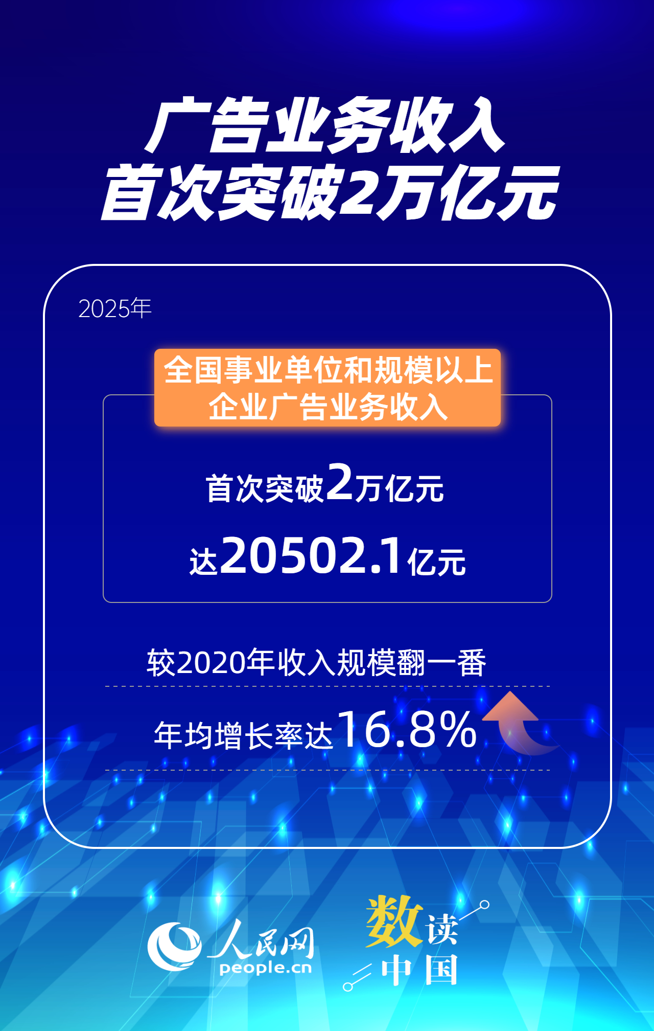 2025年,全國事業(yè)單位和規(guī)模以上企業(yè)廣告業(yè)務(wù)收入首次突破2萬億元,較2020年收入規(guī)模翻一番;互聯(lián)網(wǎng)廣告業(yè)務(wù)收入13574.3億元,比上年增長34.6%……我國廣告產(chǎn)業(yè)保持快速發(fā)展,反映了企業(yè)預(yù)期向好和市場(chǎng)消費(fèi)信心,為構(gòu)建現(xiàn)代化產(chǎn)業(yè)體系提供了專業(yè)化支撐。