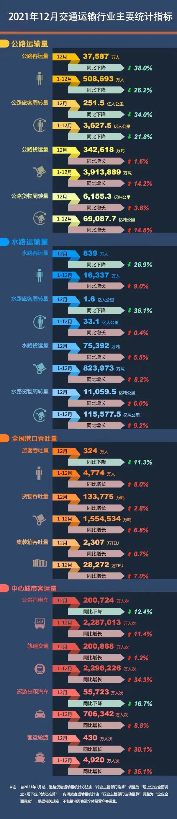 人民網(wǎng)北京1月20日電 (記者王連香)今日,交通運輸部發(fā)布2021年12月交通運輸行業(yè)主要統(tǒng)計指標(biāo),數(shù)據(jù)顯示,12月公路客運量37587萬人、水路客運量839萬人、港口旅客吞吐量324萬人,中心城市軌道交通客運量200868萬人次。