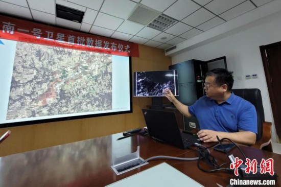 “海南一號(hào)”衛(wèi)星項(xiàng)目副總設(shè)計(jì)師王雷介紹衛(wèi)星數(shù)據(jù)詳情!⊥鯐员 攝