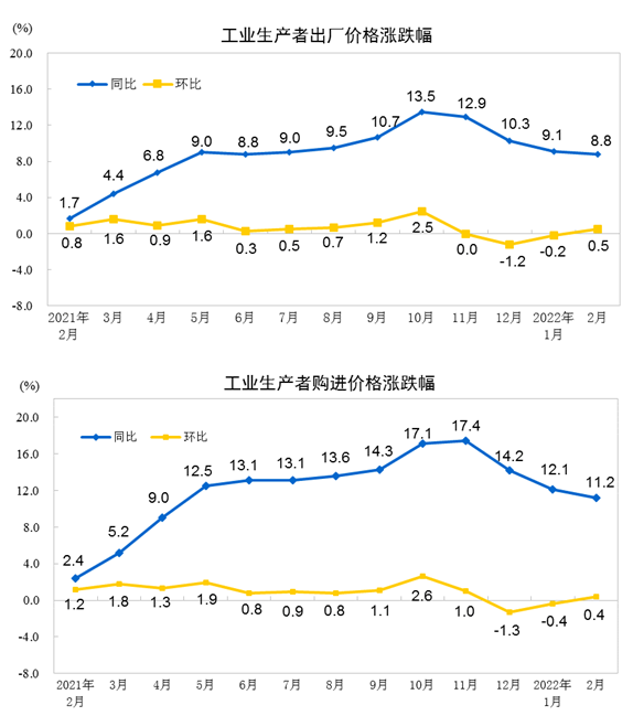 人民網(wǎng)北京3月9日電 (記者楊曦)國家統(tǒng)計局今日公布數(shù)據(jù)顯示,2022年2月份,全國工業(yè)生產(chǎn)者出廠價格同比上漲8.8%,環(huán)比上漲0.5%;工業(yè)生產(chǎn)者購進價格同比上漲11.2%,環(huán)比上漲0.4%。1—2月平均,工業(yè)生產(chǎn)者出廠價格比去年同期上漲8.9%,工業(yè)生產(chǎn)者購進價格上漲11.6%。