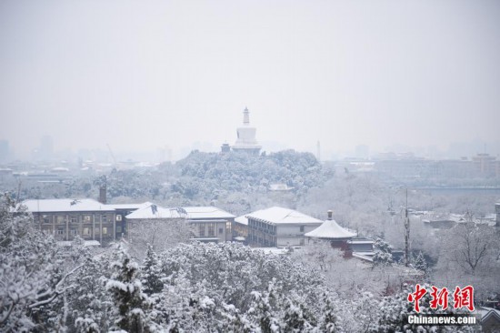 3月18日,雪中的北京北海公園白塔。當(dāng)日,北京持續(xù)降雪降溫。 中新社記者 田雨昊 攝