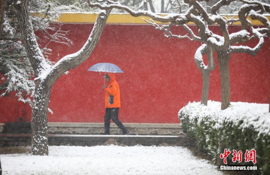 3月18日,北京市民冒雪在日壇公園游覽,雪中日壇美景如畫。北京市氣象臺(tái)當(dāng)日發(fā)布暴雪藍(lán)色預(yù)警信號(hào)。 中新社記者 趙雋 攝