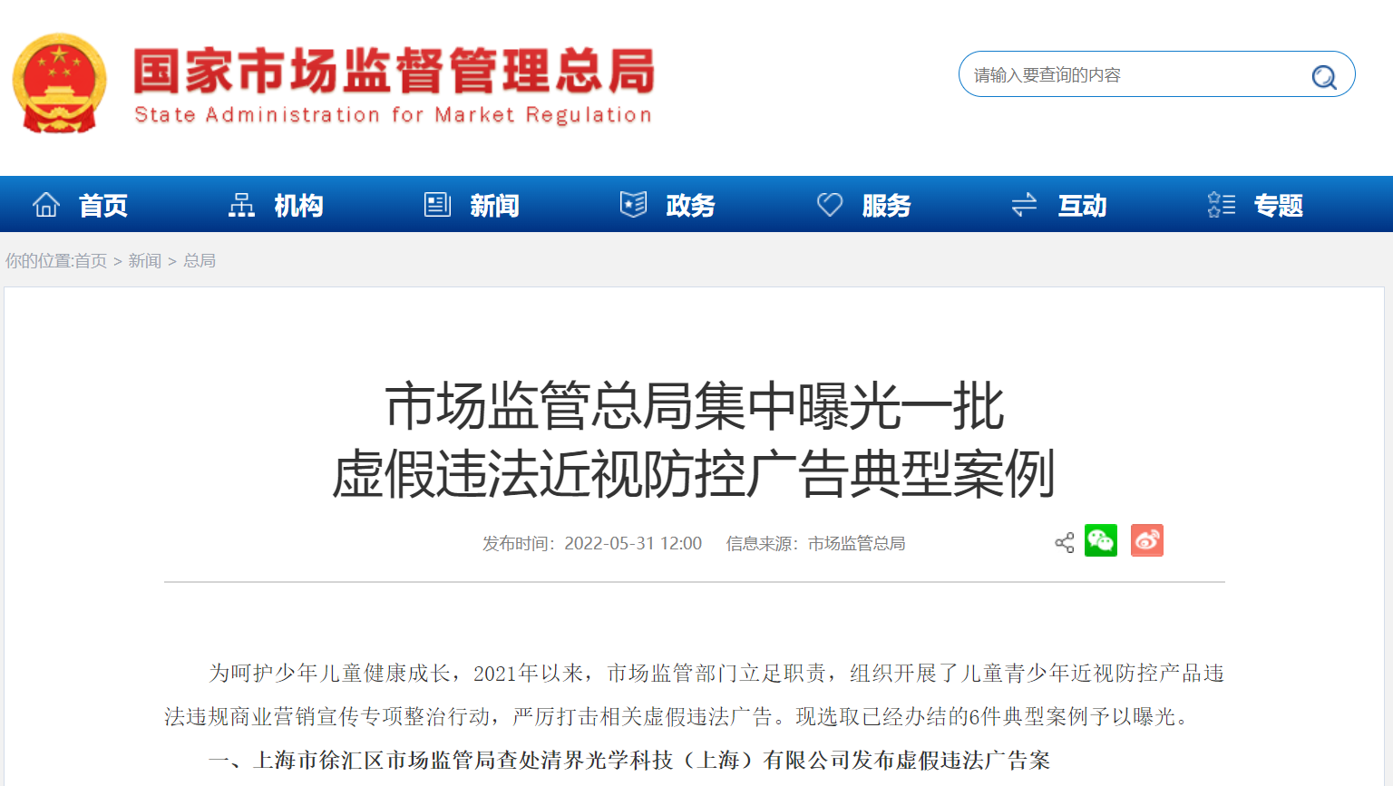 - 圖片來源:市場監(jiān)管總局官網(wǎng) 人民網(wǎng)北京5月31日電 (記者楊曦)據(jù)市場監(jiān)管總局消息,2021年以來,市場監(jiān)管部門立足職責(zé),組織開展了兒童青少年近視防控產(chǎn)品違法違規(guī)商業(yè)營銷宣傳專項整治行動,嚴(yán)厲打擊相關(guān)虛假違法廣告。 現(xiàn)選取已經(jīng)辦結(jié)的6件典型案例予以曝光,分別為: 一、上海市徐匯區(qū)市場監(jiān)管局查處清界光學(xué)科技(上海)有限公司發(fā)布虛假違法廣告案 上海市徐匯區(qū)市場監(jiān)管局調(diào)查查明,清界光學(xué)科技(上海)有限公司在多個小區(qū)、地鐵站等區(qū)域發(fā)布含有“真性近視逆轉(zhuǎn)……摘掉眼鏡”等內(nèi)容的廣告;在其公司網(wǎng)站、微信公眾號上發(fā)布含有“清界視康:結(jié)果(去根,一生無憂)不是矯正,是逐漸徹底恢復(fù)!
