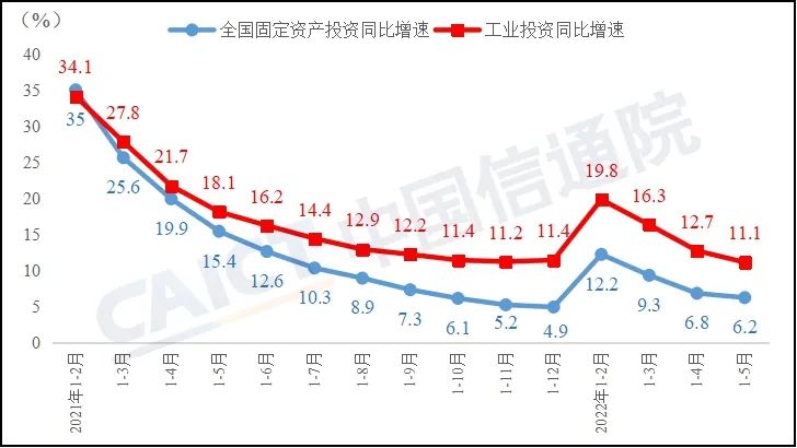 中國信息通信研究院介紹,工業(yè)投資是拉動(dòng)全國固定資產(chǎn)投資增長的重要支撐。1-5月份,我國工業(yè)投資同比增長11.1%,增速較全國固定資產(chǎn)投資高4.9個(gè)百分點(diǎn),自2021年3月份以來連續(xù)14個(gè)月高于全國固定資產(chǎn)投資增速;但受二季度疫情影響,工業(yè)投資增速較一季度放緩5.2個(gè)百分點(diǎn)。