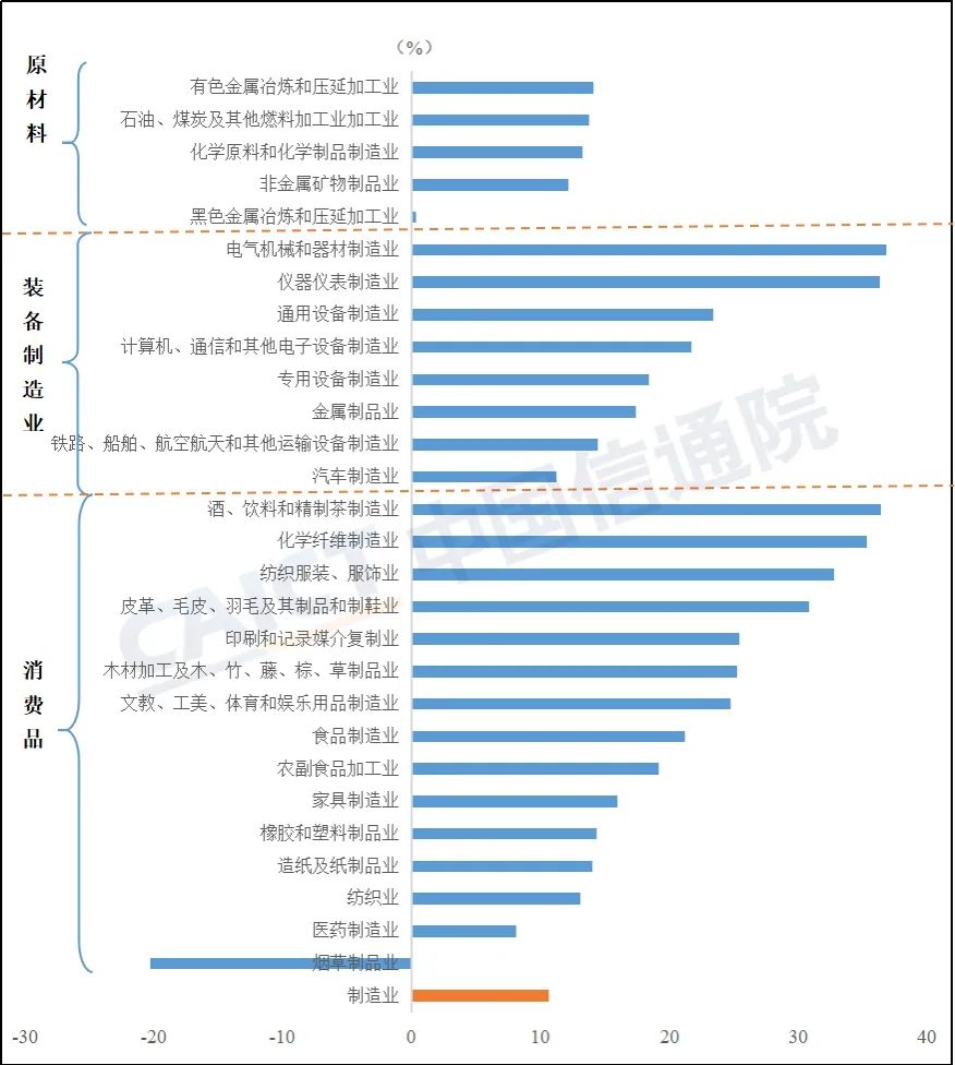 分行業(yè)工業(yè)投資累計(jì)增速。數(shù)據(jù)來源:國家統(tǒng)計(jì)局,中國信通院整理