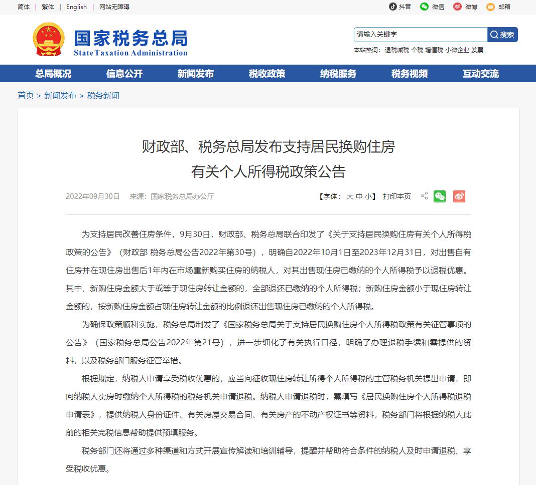 9月30日,財政部、稅務(wù)總局聯(lián)合印發(fā)了《關(guān)于支持居民換購住房有關(guān)個人所得稅政策的公告》。來源:國家稅務(wù)總局