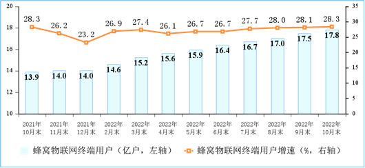 “物超人”步伐持續(xù)加大,IPTV用戶穩(wěn)步增長。截至10月末,三家基礎電信企業(yè)發(fā)展蜂窩物聯(lián)網(wǎng)終端用戶17.77億戶,比上年末凈增3.79億戶;已超移動電話用戶數(shù)9482萬戶,占移動網(wǎng)終端連接數(shù)(包括移動電話用戶和蜂窩物聯(lián)網(wǎng)終端用戶)的比重已達51.4%。IPTV(網(wǎng)絡電視)總用戶數(shù)達3.74億戶,比上年末凈增2532萬戶。