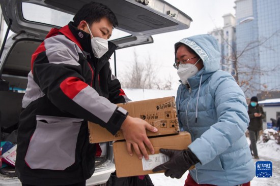 12月2日,在烏魯木齊市葦湖梁電廠家屬院小區(qū)門口,順豐速運的攬投員為居民送貨。