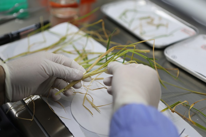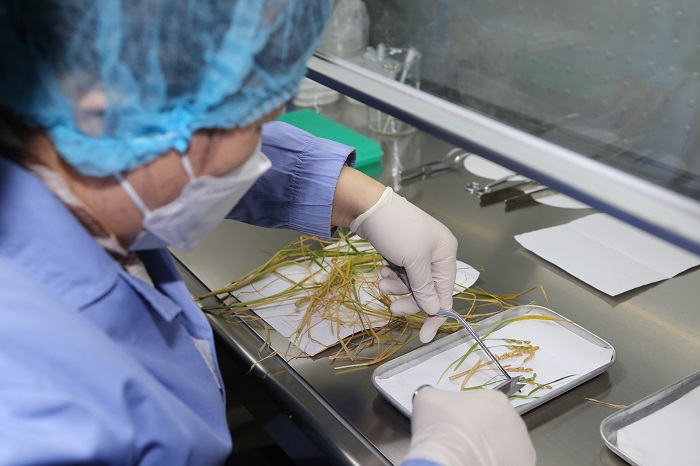 中科院分子植物卓越中心鄭慧瓊研究員對返回水稻和擬南芥科學實驗樣品進行分解與固化。中科院空間應用中心供圖