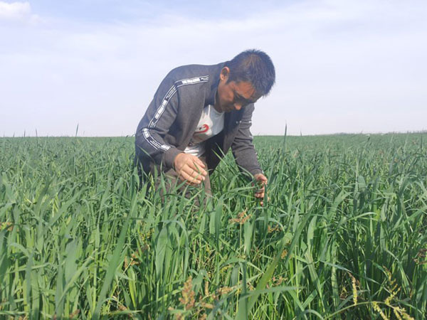 許濤在燕麥生長期查看長勢。(受訪者供圖)