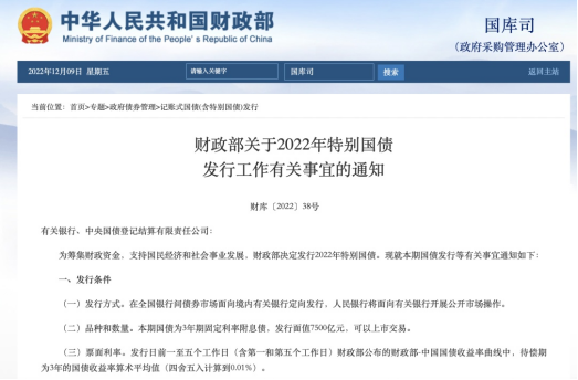 人民網(wǎng)北京12月12日電 (記者任妍)12月9日,財(cái)政部網(wǎng)站發(fā)布了《關(guān)于2022年特別國(guó)債發(fā)行工作有關(guān)事宜的通知》(以下簡(jiǎn)稱《通知》)!锻ㄖ诽岬,為籌集財(cái)政資金,支持國(guó)民經(jīng)濟(jì)和社會(huì)事業(yè)發(fā)展,財(cái)政部決定發(fā)行2022年特別國(guó)債。本期國(guó)債為3年期固定利率附息債,發(fā)行面值7500億元,可以上市交易。發(fā)行日和起息日為2022年12月12日。