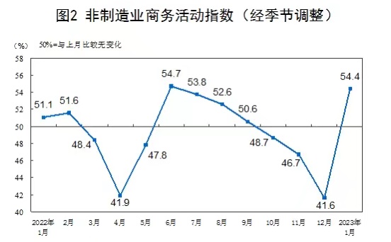 1月份,非制造業(yè)商務(wù)活動指數(shù)為54.4%,比上月上升12.8個百分點,重返擴(kuò)張區(qū)間,非制造業(yè)景氣水平觸底回升。