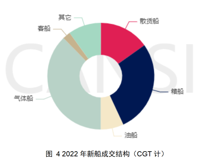 成交船型結(jié)構(gòu)也出現(xiàn)新變化,氣體船奪得成交冠軍,集裝箱船、散貨船分列二、三。2022年,氣體船成交218艘、1595萬CGT,占成交總量的37.7%(CGT計,以下均是);集裝箱船成交342艘、1184萬CGT,占成交總量的27.9%;散貨船成交419艘、643萬CGT,占成交總量的15.2%。