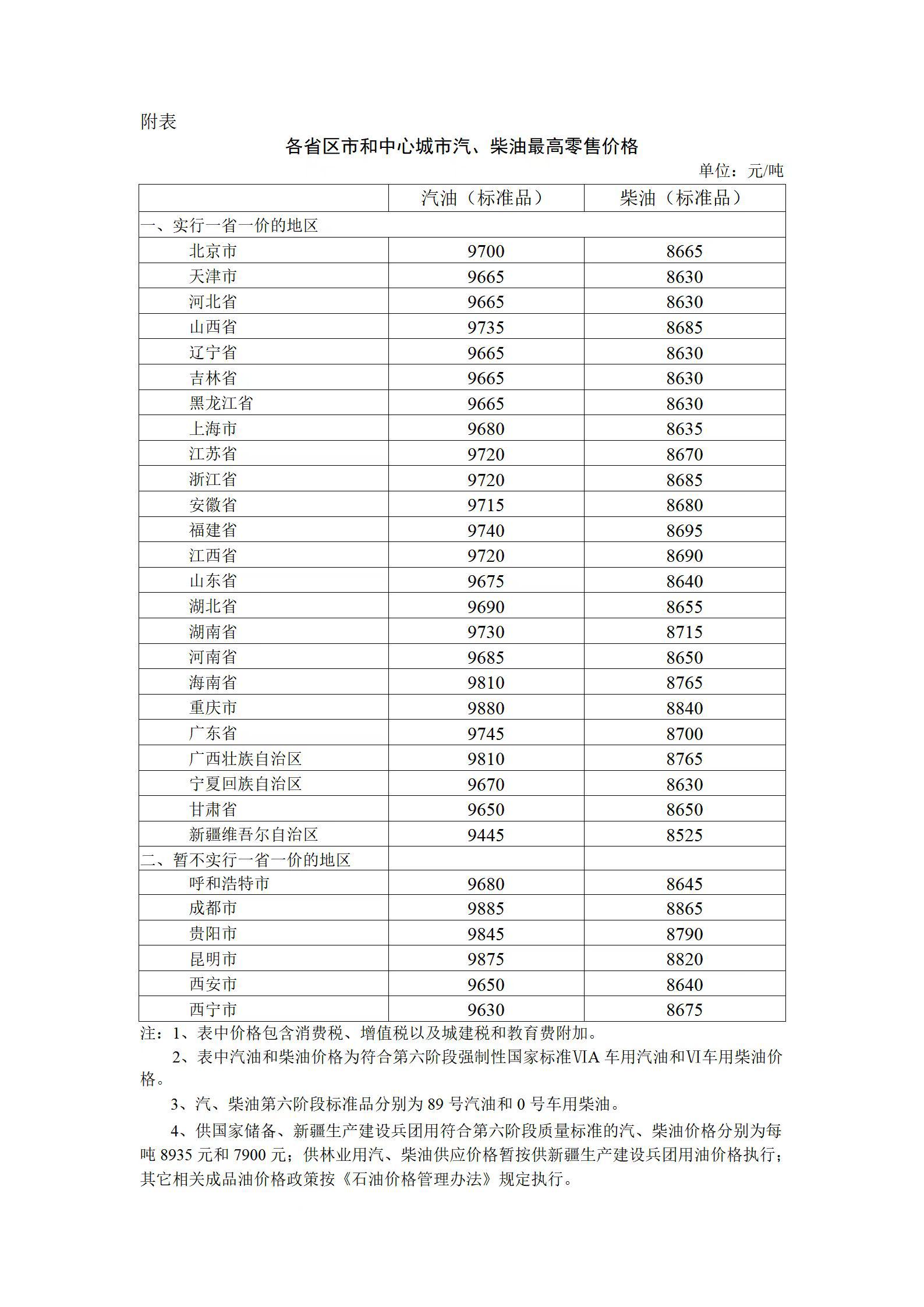 附:各省區(qū)市和中心城市汽、柴油最高零售價(jià)格