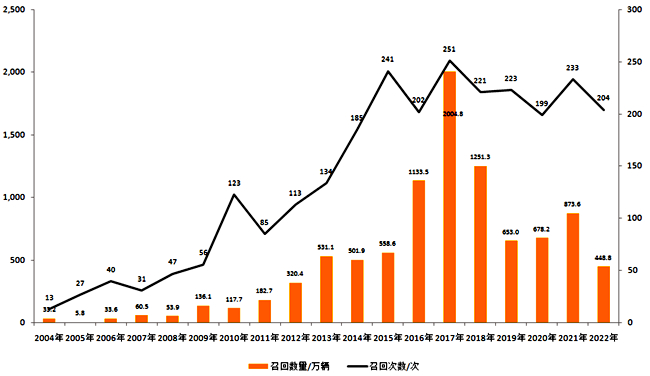 2004-2022年汽車產(chǎn)品召回的次數(shù)與數(shù)量。圖片來源:市場監(jiān)管總局