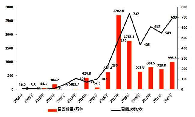 2008-2022年消費品召回的次數(shù)與數(shù)量。圖片來源:市場監(jiān)管總局