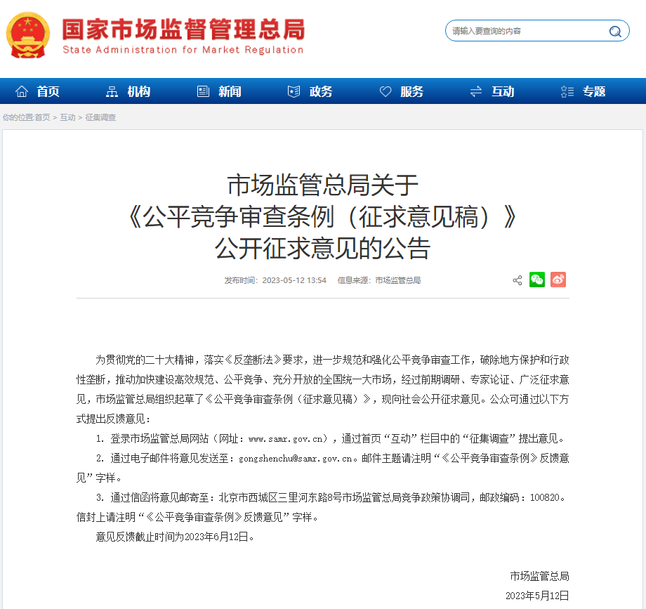 - 圖片來源:市場監(jiān)管總局官網(wǎng) 人民網(wǎng)北京5月12日電 (記者楊曦)據(jù)市場監(jiān)管總局消息,為貫徹黨的二十大精神,落實《反壟斷法》要求,進一步規(guī)范和強化公平競爭審查工作,破除地方保護和行政性壟斷,推動加快建設(shè)高效規(guī)范、公平競爭、充分開放的全國統(tǒng)一大市場,經(jīng)過前期調(diào)研、專家論證、廣泛征求意見,市場監(jiān)管總局組織起草了《公平競爭審查條例(征求意見稿)》,向社會公開征求意見。 據(jù)介紹,《條例》在總則中規(guī)定了立法目的,對公平競爭審查進行了定義,明確公平競爭審查工作堅持中國共產(chǎn)黨的領(lǐng)導,確定審查主體和落實公平競爭審查的主體責任,要求在國家和地方層面建立公平競爭審查協(xié)調(diào)機制,并對人員經(jīng)費保障、信息化建設(shè)和競爭倡導等作出規(guī)定。…