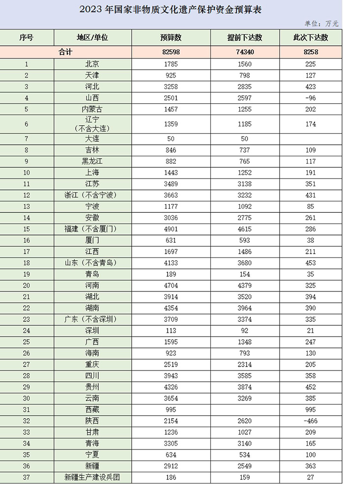 2023年國家非物質(zhì)文化遺產(chǎn)保護(hù)資金預(yù)算表。圖片來源:財政部官網(wǎng)