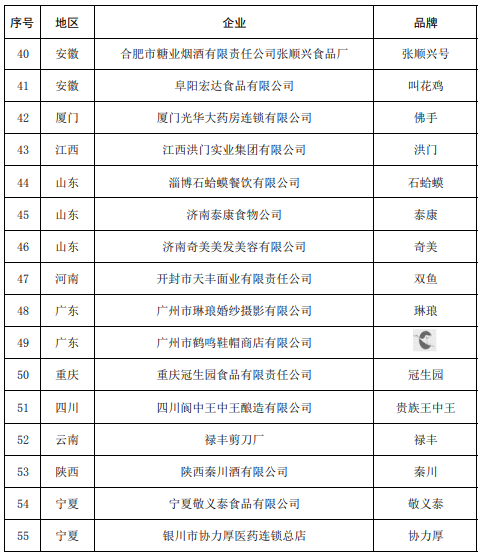 根據(jù)《通知》,55個沒有通過中華老字號復(fù)核的品牌包括北京華女、天津稻香村、山西寶興善、內(nèi)蒙古大盛魁、大連群英樓、黑龍江正陽河、上海老半齋、山東泰康、河南雙魚、廣東琳瑯、重慶冠生園、云南祿豐、陜西秦川、寧夏敬義泰等。