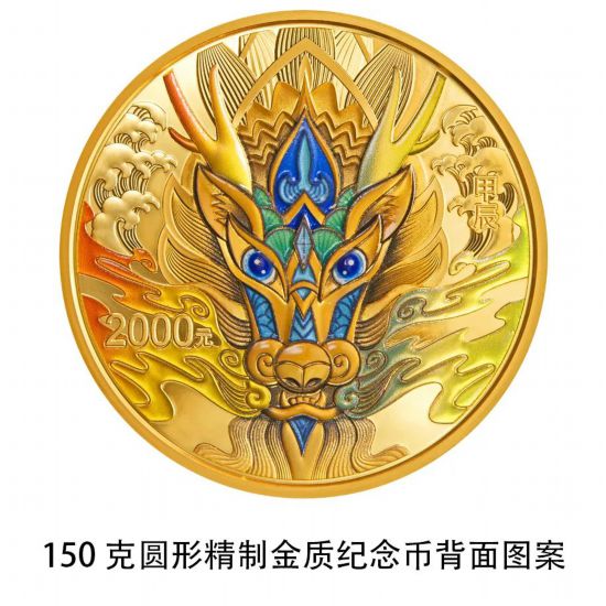 背面圖案共12幅,均刊“甲辰”字樣及面額。其中,10公斤圓形金質(zhì)紀念幣背面圖案為龍造型,襯以祥云組合設(shè)計。