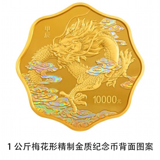 1公斤梅花形金質(zhì)紀念幣背面圖案為龍造型,襯以祥云組合設(shè)計。