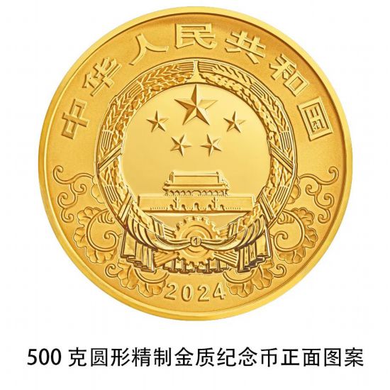 500克圓形金質(zhì)紀念幣為精制幣,含純金500克,直徑80毫米,面額5000元,成色99.9%,最大發(fā)行量500枚。