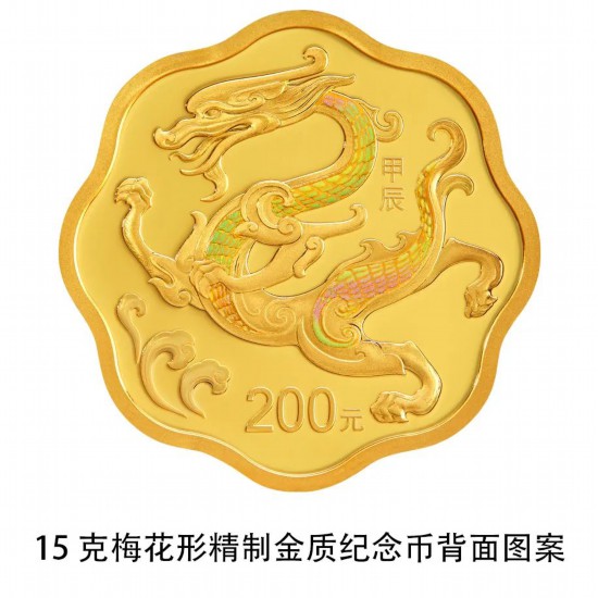15克梅花形金質(zhì)紀念幣背面圖案為龍造型,襯以浪花組合設(shè)計。