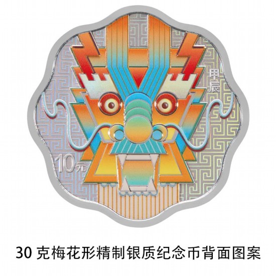 30克梅花形銀質(zhì)紀念幣背面圖案為裝飾龍造型,襯以回紋紋飾。