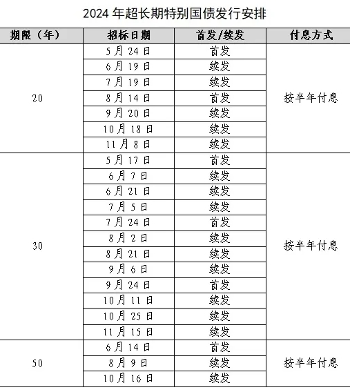 根據(jù)此次安排,今年超長期特別國債發(fā)行期限分別為20年、30年和50年,付息方式均為按半年付息。其中,20年期超長期特別國債發(fā)行7只,首發(fā)2只、續(xù)發(fā)5只;30年期超長期特別國債發(fā)行12只,首發(fā)3只、續(xù)發(fā)9只;50年期超長期特別國債發(fā)行3只,首發(fā)1只、續(xù)發(fā)2只。