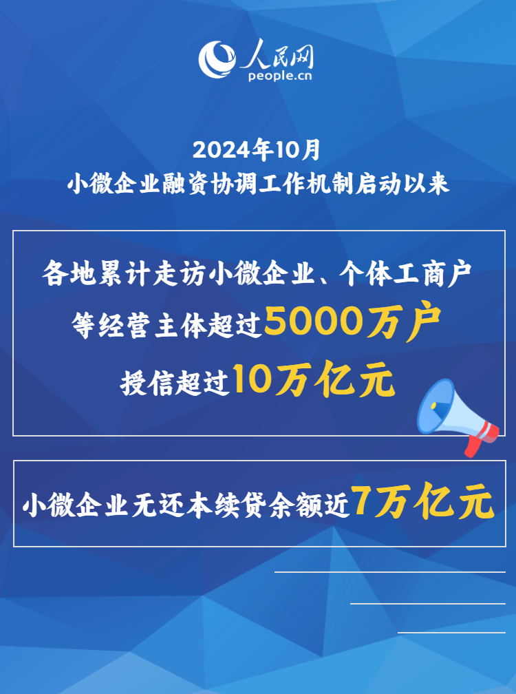 人民網(wǎng)北京2月26日電 (記者羅知之)2月25日,金融監(jiān)管總局、國家發(fā)展改革委聯(lián)合召開支持小微企業(yè)融資協(xié)調(diào)工作機制推進會。會議指出,2024年10月小微企業(yè)融資協(xié)調(diào)工作機制啟動以來,在各地黨委政府的高效統(tǒng)籌下,在相關(guān)部門、銀行機構(gòu)的密切配合下,四級工作機制迅速搭建、有序運行,取得階段性成效。各地累計走訪小微企業(yè)、個體工商戶等經(jīng)營主體超過5000萬戶,授信超過10萬億元。小微企業(yè)無還本續(xù)貸余額近7萬億元。