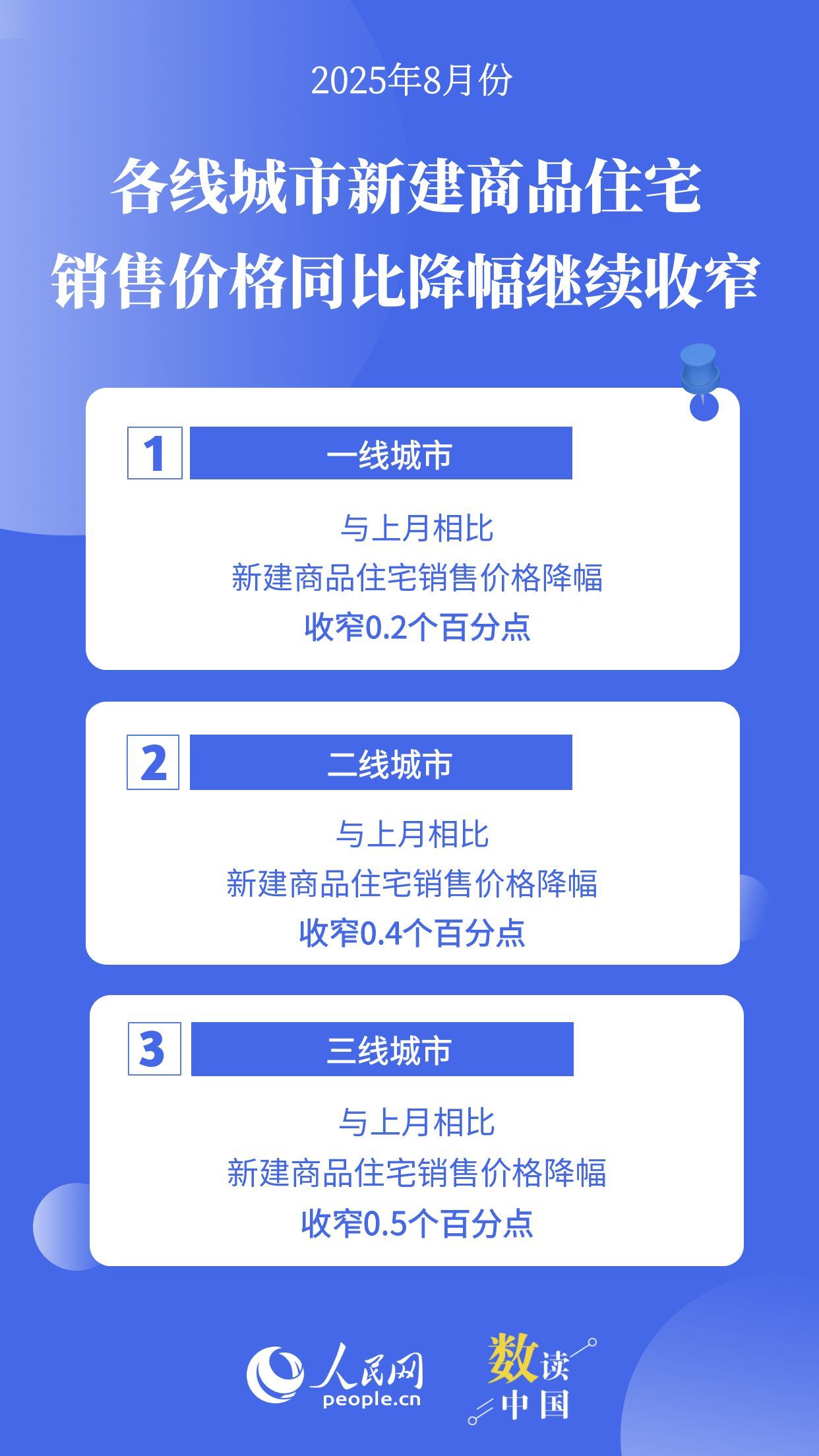 8月份,一線城市新建商品住宅銷售價格同比下降0.9%,降幅比上月收窄0.2個百分點。其中,上海上漲5.9%,北京、廣州和深圳分別下降3.5%、4.3%和1.7%。二、三線城市新建商品住宅銷售價格同比分別下降2.4%和3.7%,降幅分別收窄0.4個和0.5個百分點。