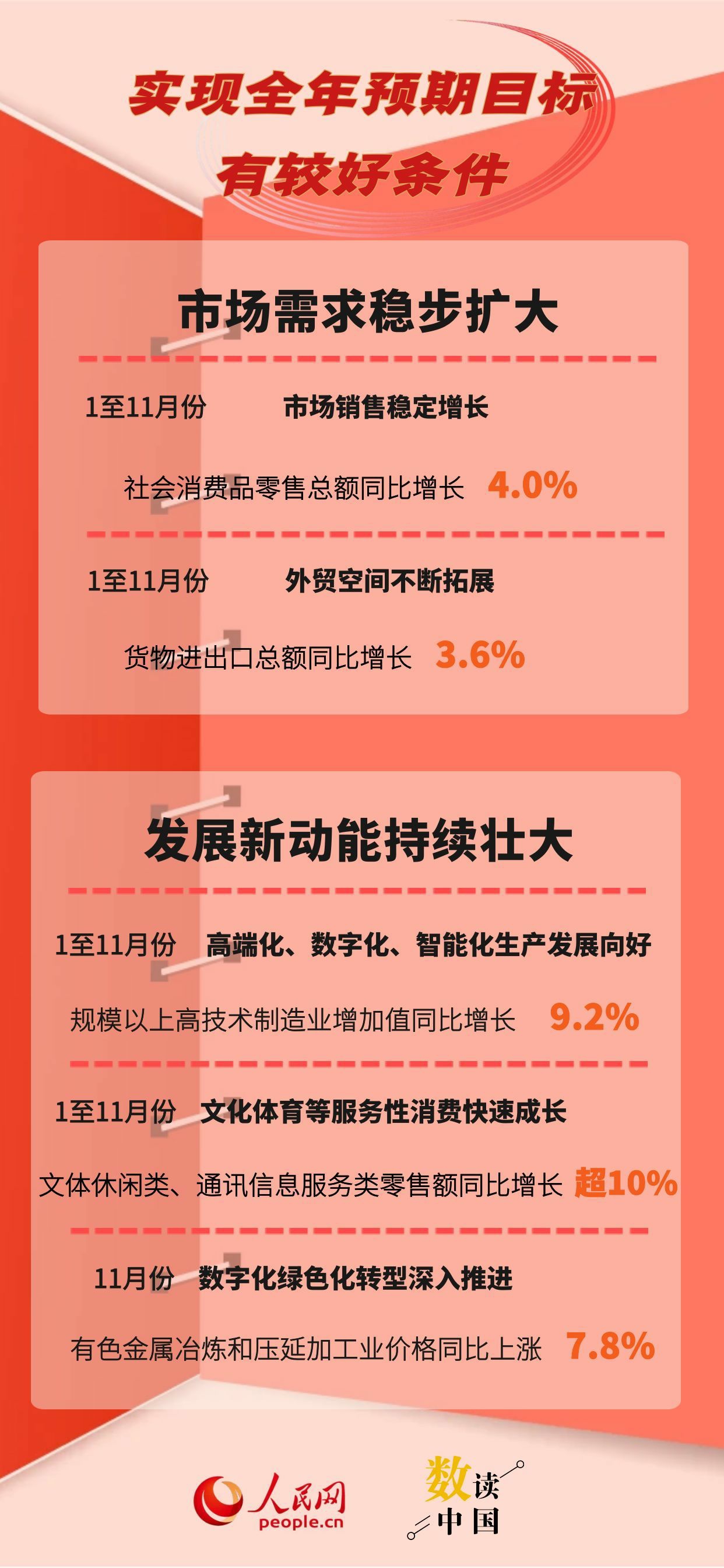 一是市場需求穩(wěn)步擴大。提振消費專項行動有效實施,消費潛能繼續(xù)釋放。1-11月份,社會消費品零售總額同比增長4%,快于上年全年。限額以上商品零售額中,以舊換新類和升級類相關商品銷售保持較快增長,消費新場景新業(yè)態(tài)不斷涌現(xiàn)和迭代升級,服務零售額較快增長。1-11月份,服務零售額同比增長5.4%,繼續(xù)快于商品零售額。大力推進自主開放,積極發(fā)展數(shù)字貿(mào)易、綠色貿(mào)易,外貿(mào)空間不斷拓展。1-11月份,我國貨物進出口總額同比增長3.6%,其中對東盟、歐盟、非洲進出口額分別增長8.5%、5.4%和18.7%。市場需求的擴大,對經(jīng)濟的帶動作用將繼續(xù)顯現(xiàn)。